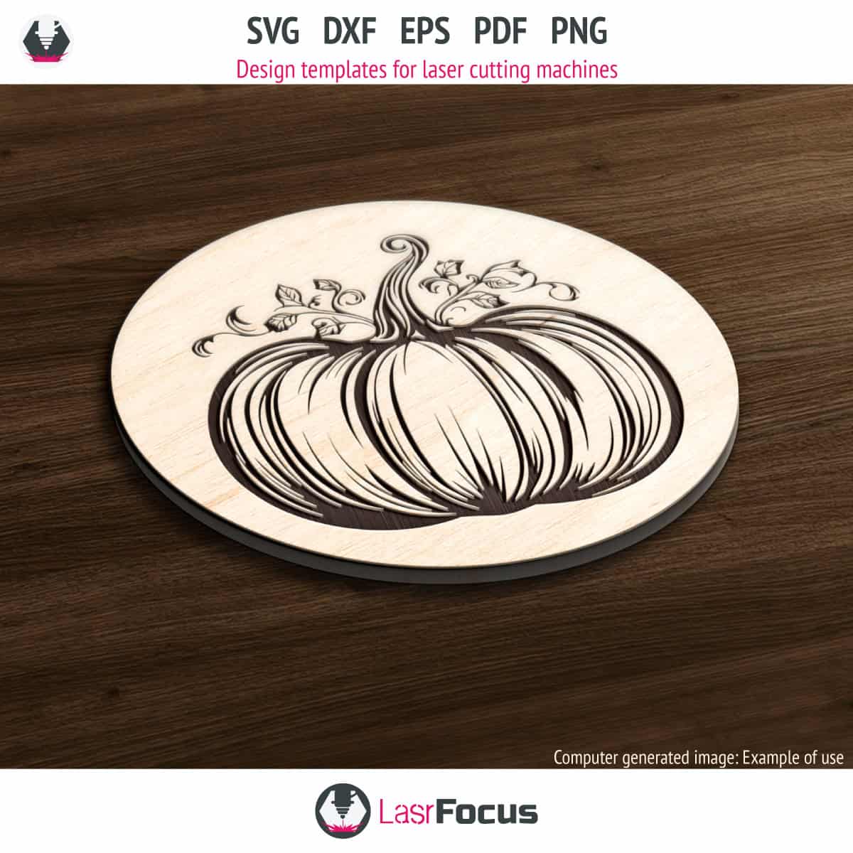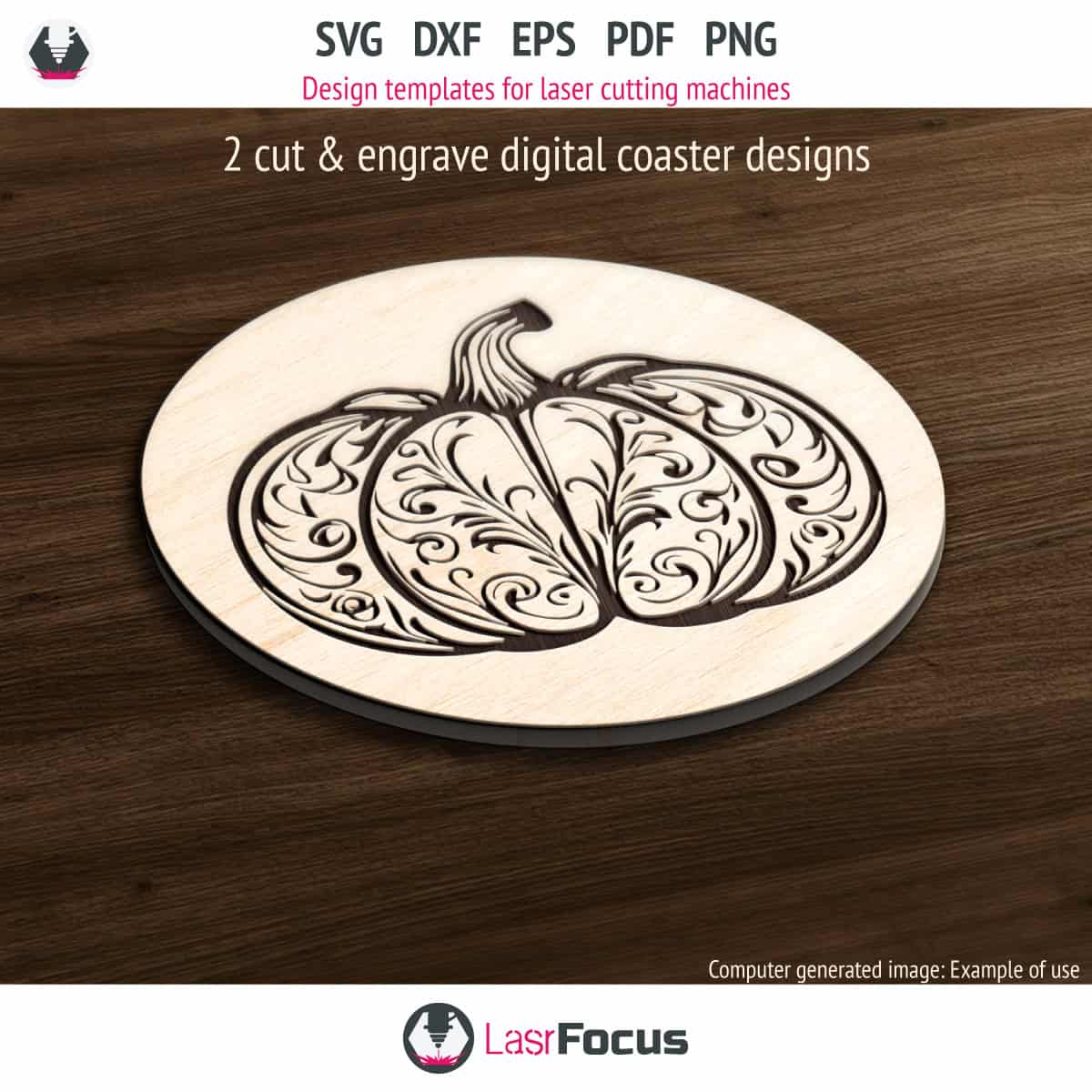 You’ll get the free pumpkin coaster laser cut and engrave files shown in the preview photo, combined in a .zip file that includes the following formats: